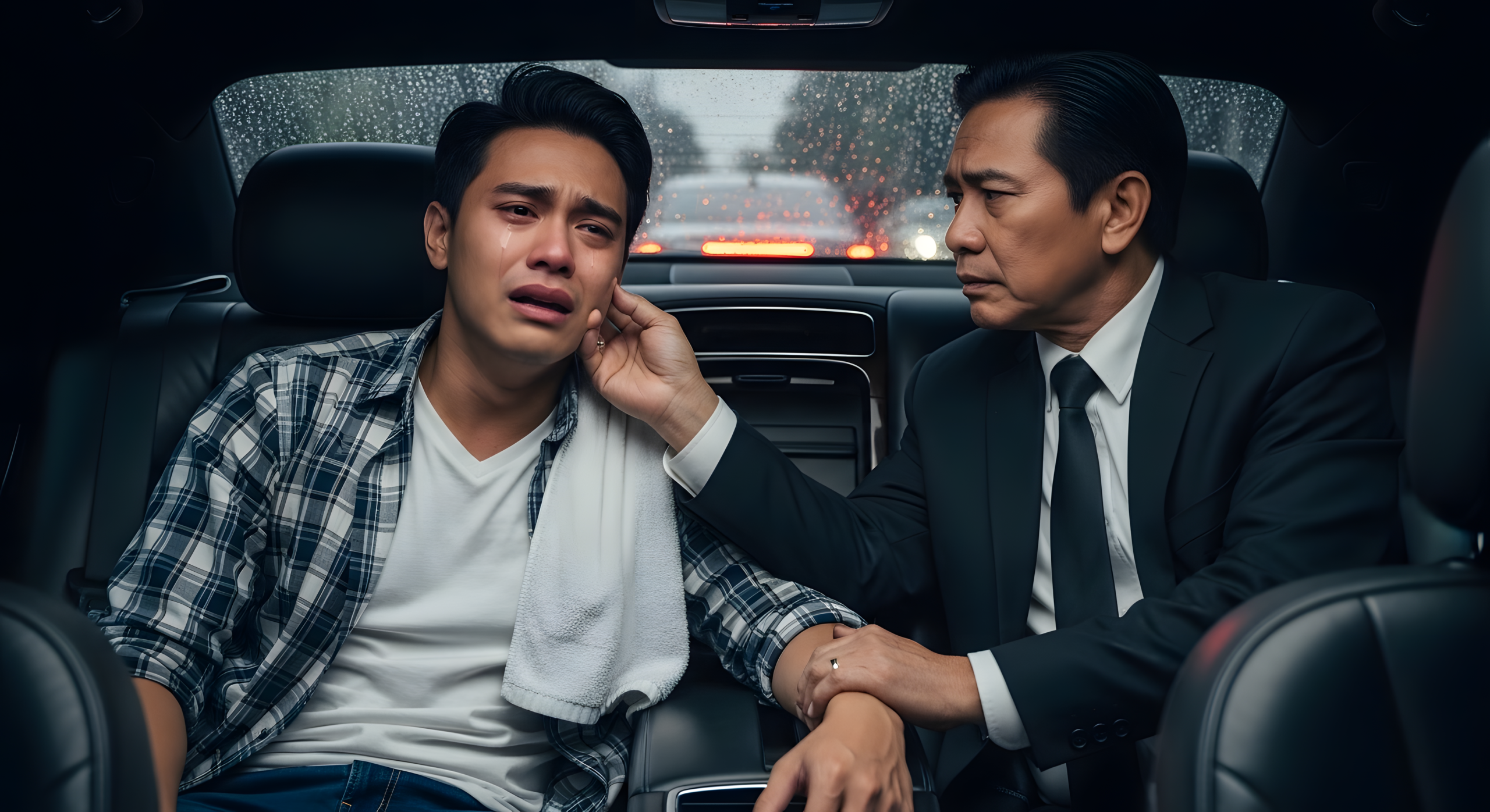 Sumakay ako sa tabi niya. Ang loob ng sasakyan ay mainit at komportable, malayo sa lamig ng labas. Inabutan niya ako ng tuwalya.