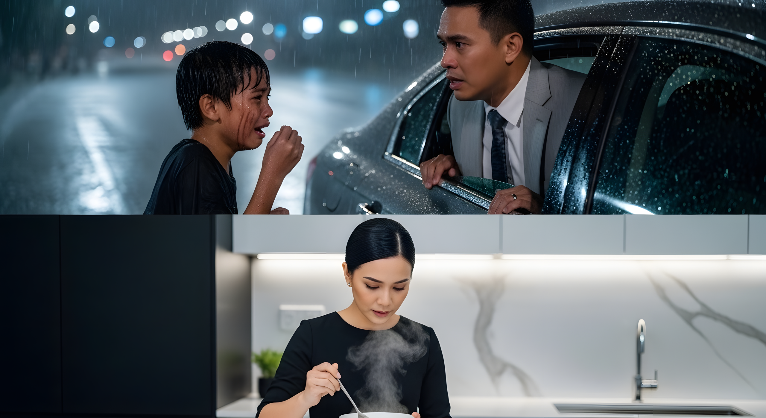 Isang batang lalaki ang nakatayo sa tabi niya — marumi ang damit, payat, at halatang gutom.