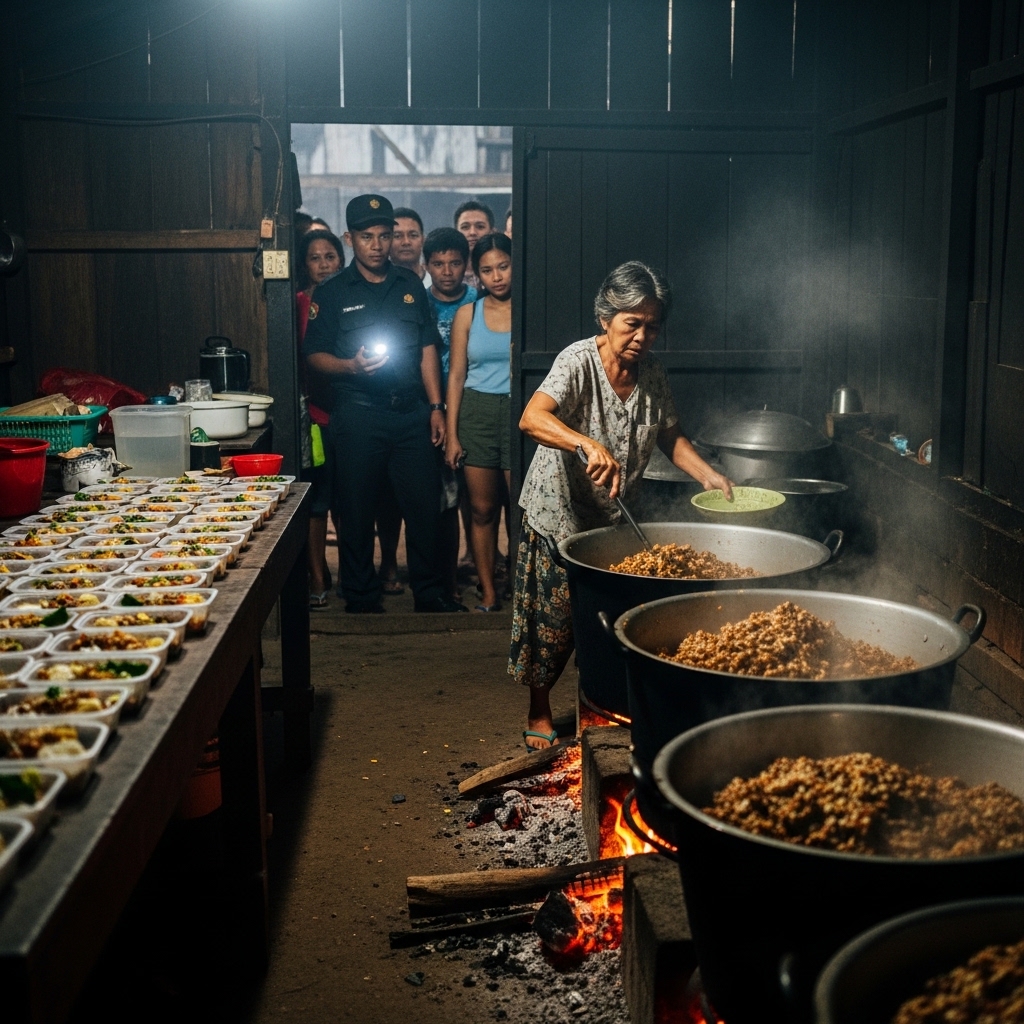 Walang mga itinatagong paninda. Sa halip, tumambad sa kanila ang tatlong dambuhalang kawa na nakapatong sa nagbabagang kahoy. Sa unang kawa ay kumukulo ang mainit na arroz caldo na sinangkapan ng manok at itlog na maalat. Sa ikalawa naman ay nag-uumapaw na misua patola na ginamitan ng mga nirepack na sardinas. Sa mahabang lamesa ay may daan-daang malinis na plastic containers, handa nang ipamahagi.