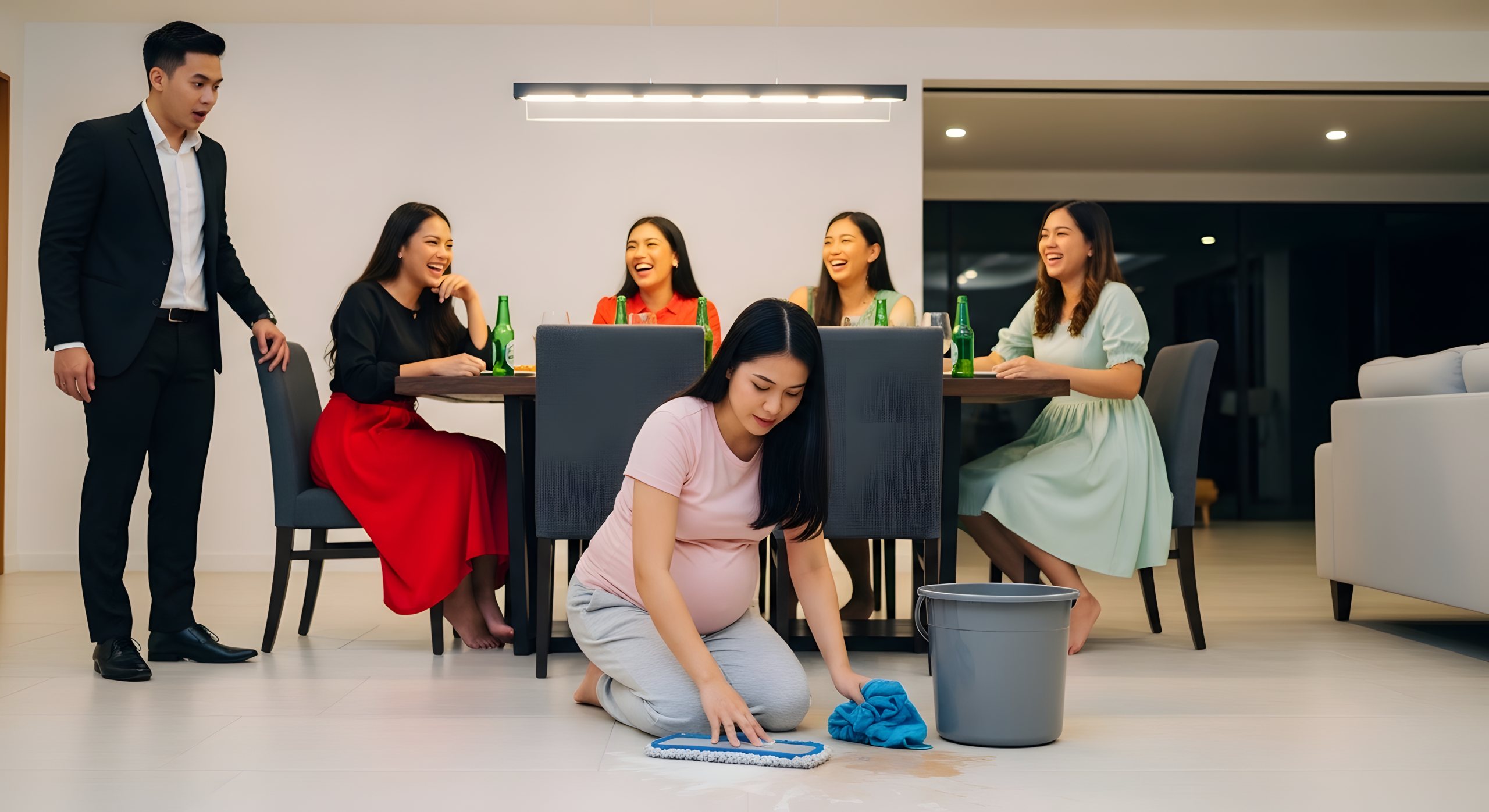Si Mia… ang buntis kong asawa… nakaluhod sa sahig, gumagapang habang pinupunasan ang marmol. Pawis na pawis. Namumula ang mukha. Hawak ang tiyan na walong buwang may laman na anak ko.